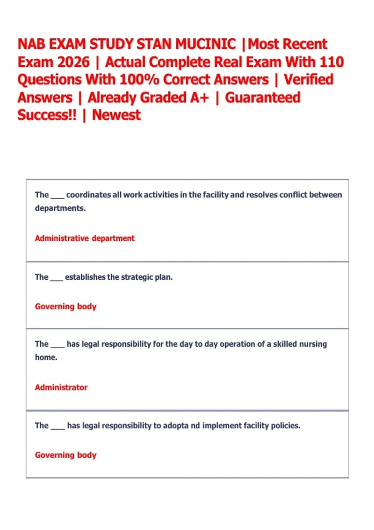 NAB EXAM STUDY STAN MUCINIC |Most Recent Exam 2026 | Actual Complete Real Exam With 110 Questions With 100% Correct Answers | Verified Answers | Already Graded A+ | Guaranteed Success!! | Newest NAB EXAM STUDY STAN MUCINIC |Most Recent Exam 2026 | Actual Complete Real Exam With 110 Questions With 100% Correct Answers | Verified Answers | Already Graded A+ | Guaranteed Success!! | Newest NAB EXAM STUDY STAN MUCINIC |Most Recent Exam 2026 | Actual Complete Real Exam With 110 Questions With 100% Correct Answers | Verified Answers | Already Graded A+ | Guaranteed Success!! | Newest NAB EXAM STUDY STAN MUCINIC |Most Recent Exam 2026 | Actual Complete Real Exam With 110 Questions With 100% Correct Answers | Verified Answers | Already Graded A+ | Guaranteed Success!! | Newest NAB EXAM STUDY STAN MUCINIC |Most Recent Exam 2026 | Actual Complete Real Exam With 110 Questions With 100% Correct Answers | Verified Answers | Already Graded A+ | Guaranteed Success!! | Newest NAB EXAM STUDY STAN MUCINIC |Most Recent Exam 2026 | Actual Complete Real Exam With 110 Questions With 100% Correct Answers | Verified Answers | Already Graded A+ | Guaranteed Success!! | Newest