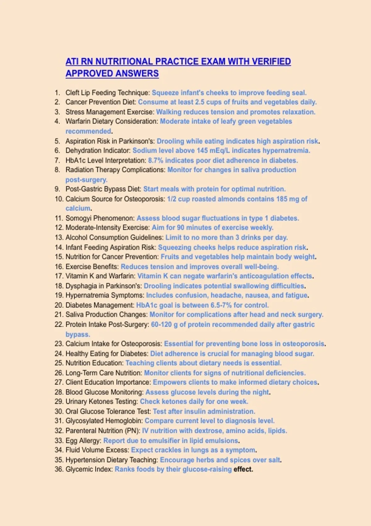 ATI RN NUTRITIONAL PRACTICE EXAM WITH VERIFIED APPROVED ANSWERS.LATEST UPDATE 2026.DONE, GRADED AND PASSED GUARANTEED SUCCESS.
