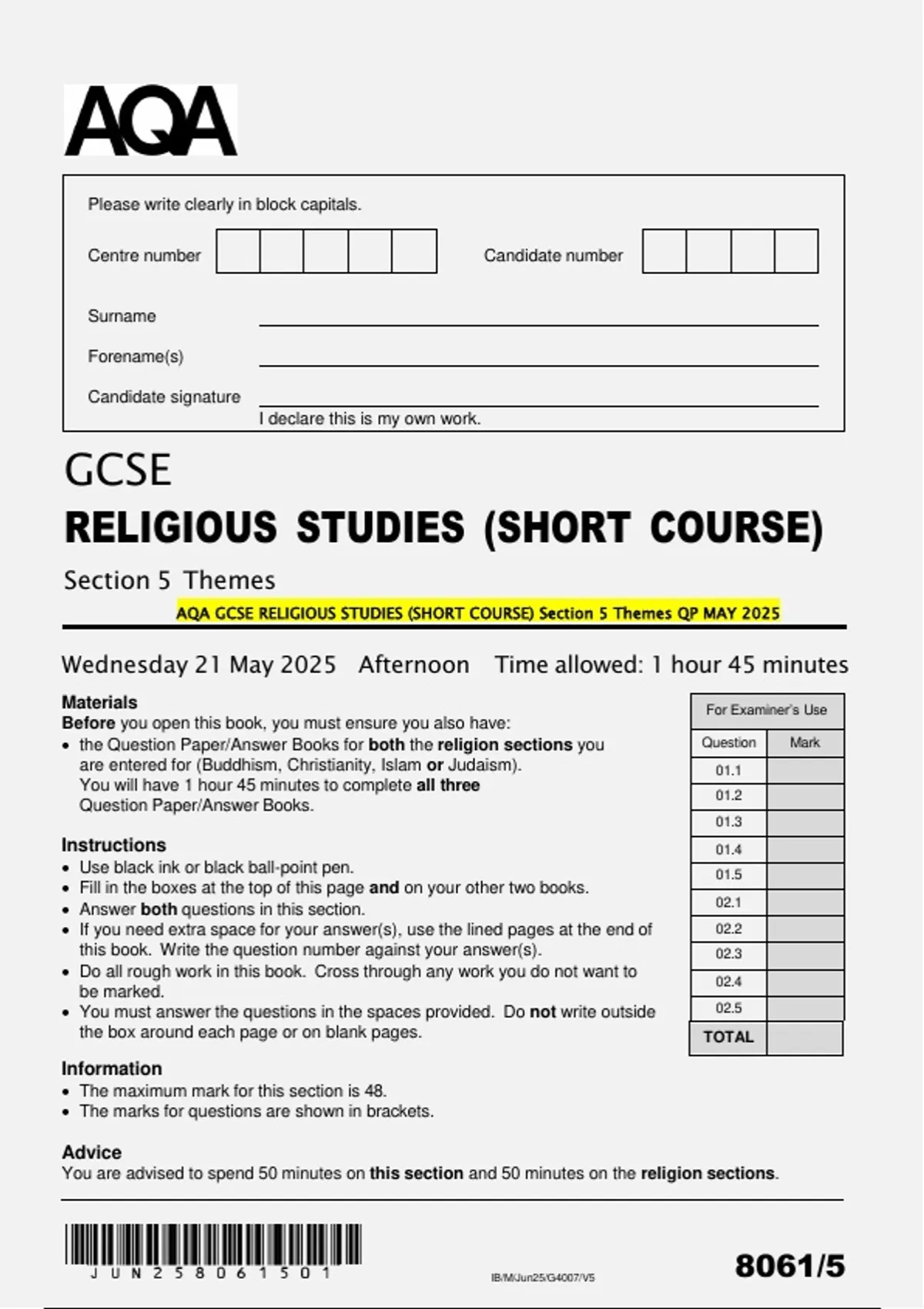 AQA GCSE RELIGIOUS STUDIES (SHORT COURSE) Section 5 Themes QP MAY 2025