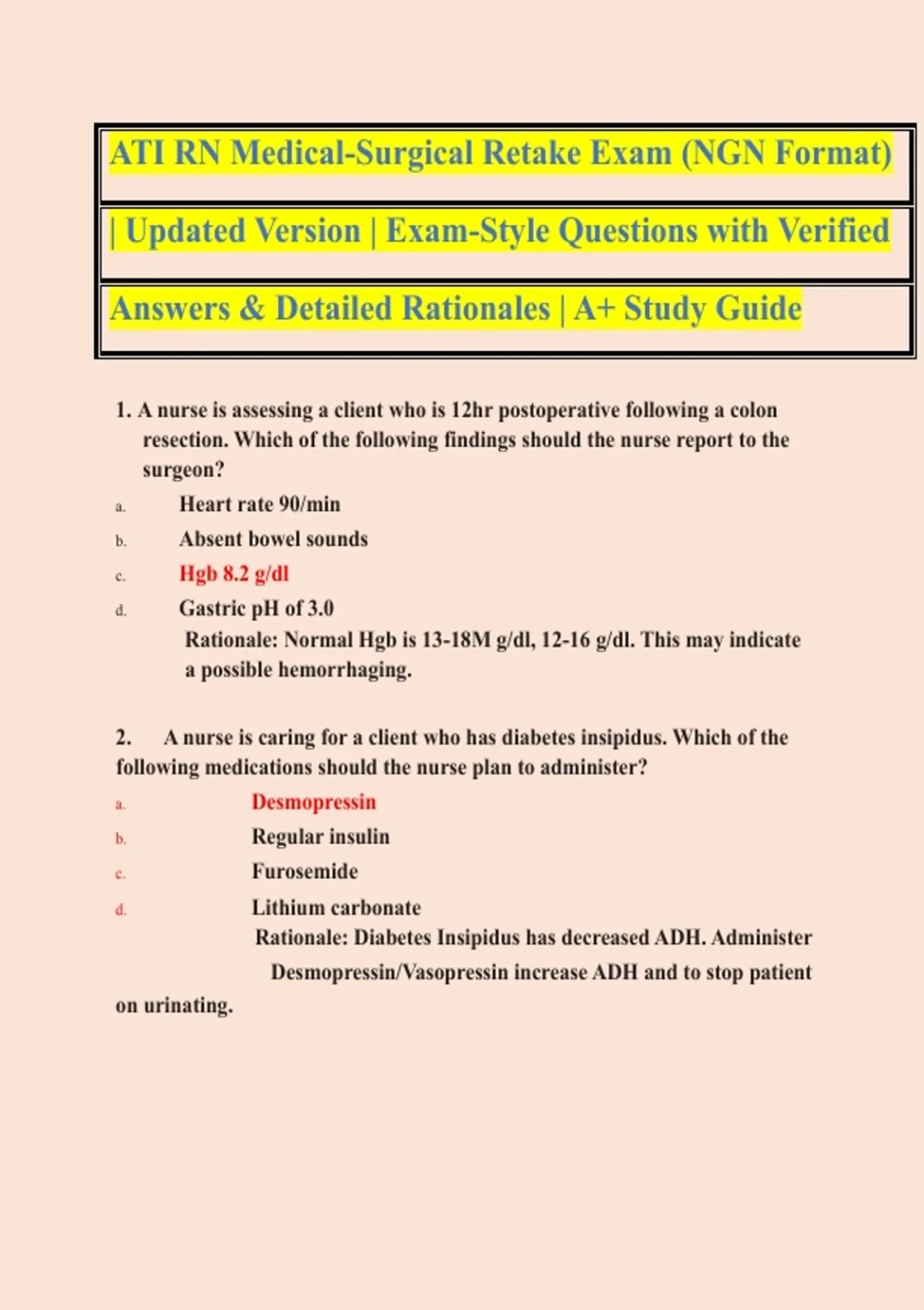 Prepare confidently for your ATI RN Medical-Surgical Retake Exam (NGN Format) with this updated, exam-focused study guide, designed to reflect the Next Generation NCLEX (NGN)–style questions currently used in ATI assessments. This resource features realistic exam-style questions, verified correct answers, and clear, detailed rationales to help you understand clinical judgment, prioritization, and decision-making concepts tested on the Medical-Surgical retake exam. What’s Included ATI RN Medical-Surgical Retake Exam (NGN format) Updated content aligned with current ATI testing standards NGN-style case-based and clinical judgment questions Verified correct answers Detailed rationales explaining the “why” behind each answer Ideal for retake preparation and remediation Who This Is For RN nursing students preparing for ATI Med-Surg retake exams Students needing NGN-style practice Learners seeking a focused A+ remediation resource This study guide is ideal for last-minute review, ATI remediation, and confidence-building before retesting, and pairs well with other ATI proctored exam bundles. ATI RN Medical Surgical Retake Exam ATI Med Surg Retake NGN ATI RN Medical Surgical NGN ATI Med Surg NGN Questions ATI RN Proctored Exam Retake ATI Medical Surgical Exam Questions and Answers ATI Med Surg Rationales NGN ATI Med Surg ATI RN Medical Surgical Updated ATI Nursing Med Surg Study Guide ATI RN Med Surg Remediation ATI NGN Exam Practice