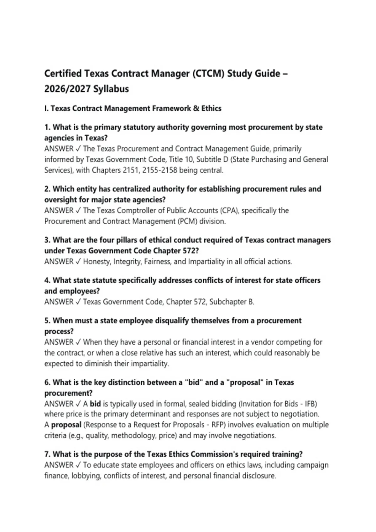 Certified Texas Contract Manager (CTCM) Study Guide – 2026/2027 Syllabus I. Texas Contract Management Framework & Ethics 1. What is the primary statutory authority governing most procurement by state agencies in Texas? ANSWER The Texas Procurement and Contract Management Guide, primarily informed by Texas Government Code, Title 10, Subtitle D (State Purchasing and General Services), with Chapters 2151, being central. 2. Which entity has centralized authority for establishing procurement rules and oversight for major state agencies? ANSWER The Texas Comptroller of Public Accounts (CPA), specifically the Procurement and Contract Management (PCM) division. 3. What are the four pillars of ethical conduct required of Texas contract managers under Texas Government Code Chapter 572? ANSWER Honesty, Integrity, Fairness, and Impartiality in all official actions. 4. What state statute specifically addresses conflicts of interest for state officers and employees? ANSWER Texas Government Code, Chapter 572, Subchapter B. 5. When must a state employee disqualify themselves from a procurement process? ANSWER When they have a personal or financial interest in a vendor competing for the contract, or when a close relative has such an interest, which could reasonably be expected to diminish their impartiality. 6. What is the key distinction between a "bid" and a "proposal" in Texas procurement? ANSWER A bid is typically used in formal, sealed bidding (Invitation for Bids - IFB) where price is the primary determinant and responses are not subject to negotiation. A proposal (Response to a Request for Proposals - RFP) involves evaluation on multiple criteria (e.g., quality, methodology, price) and may involve negotiations. 7. What is the purpose of the Texas Ethics Commission's required training? ANSWER To educate state employees and officers on ethics laws, including campaign finance, lobbying, conflicts of interest, and personal financial disclosure. 8. What is a "cone of silence" and when is it typically implemented? ANSWER It's a prohibition on unauthorized communications between potential vendors and agency personnel during an active solicitation period, from the release of the solicitation until contract award is posted. 9. What is the primary goal of the Historically Underutilized Business (HUB) program? ANSWER To promote equal opportunity in state contracting for businesses owned by minorities, women, disabled veterans, and service-disabled veterans, and to increase their participation in state procurement. 10. When is it permissible to accept a gift from a vendor or potential vendor? ANSWER It is generally not permissible under Texas Government Code Chapter 572. Exceptions are strictly limited (e.g., non-cash items valued under $50, certain meals, gifts from personal friends unrelated to official duties). II. Procurement Planning & Solicitation Development 11. What must be included in a Request for Offers (RFO) for professional services under Government Code Chapter 2254? ANSWER A description of the professional services needed, the selection criteria (including weighted factors), and a statement that fee negotiations will be conducted with the top-ranked firm. 12. What is the minimum public posting period for an Invitation for Bids (IFB) or Request for Proposals (RFP) on the Electronic State Business Daily (ESBD)? ANSWER 21 calendar days for most non-exempt procurements, unless a shorter time is justified and documented. 13. What is the purpose of a pre-proposal conference? ANSWER To explain the solicitation requirements to potential vendors, answer questions, and ensure all parties have a clear and common understanding, which helps reduce ambiguities and improve response quality.