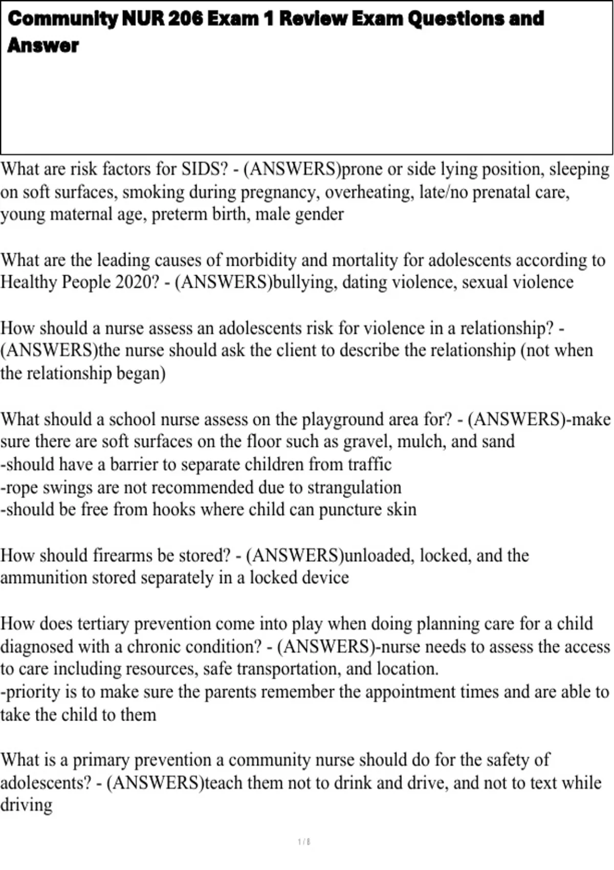 Community NUR 206 Exam 1 Review Exam Questions and