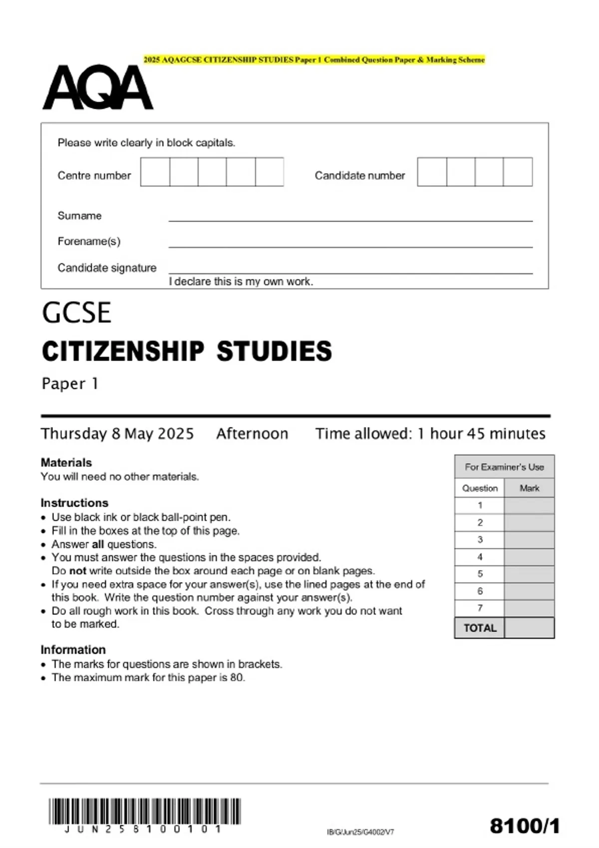 2025 aqagcse citizenship studies paper 1 combined