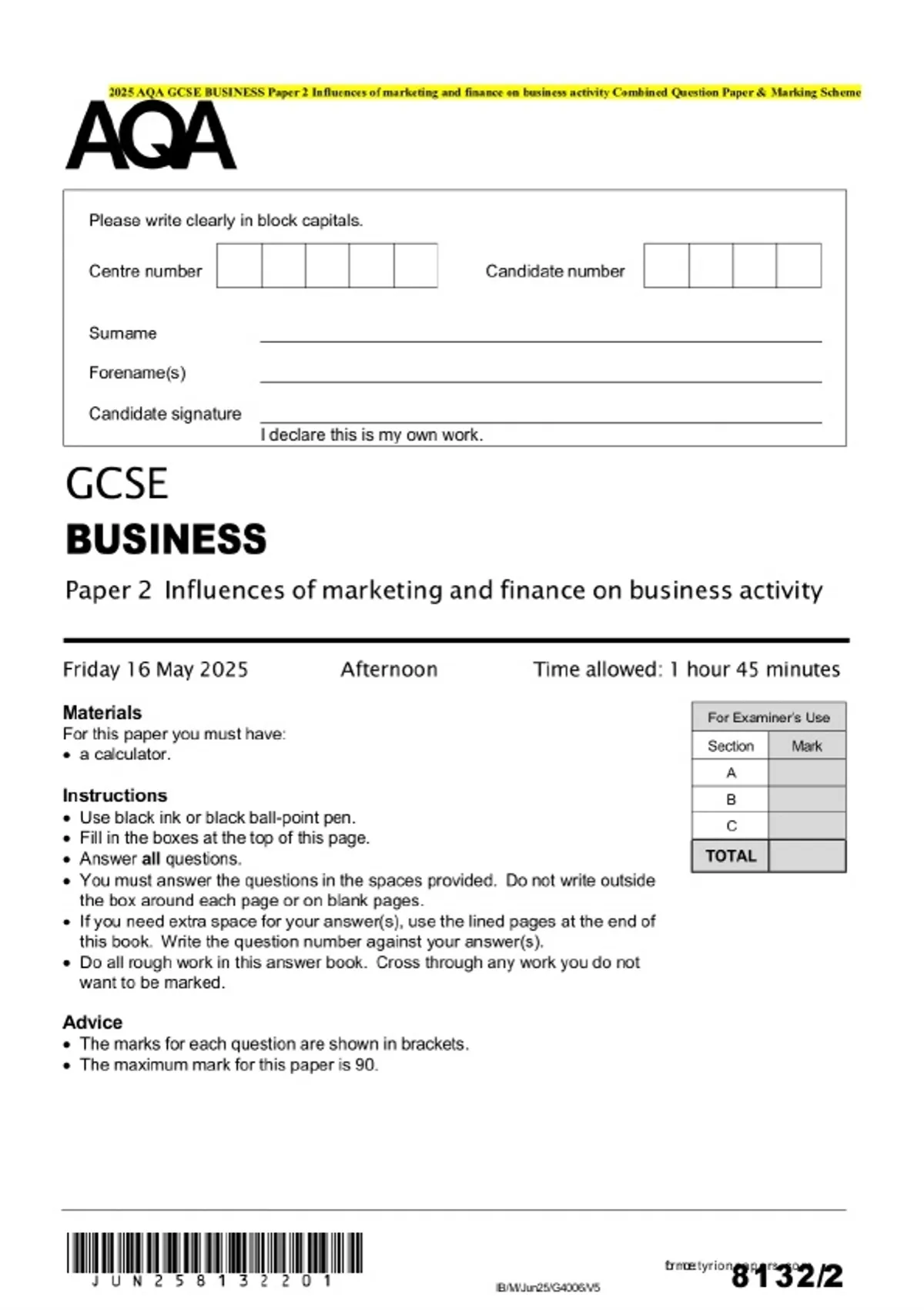 Package Deal-::2025 AQA GCSE BUSINESS Paper 1&2 Question Paper & Marking Scheme MERGED