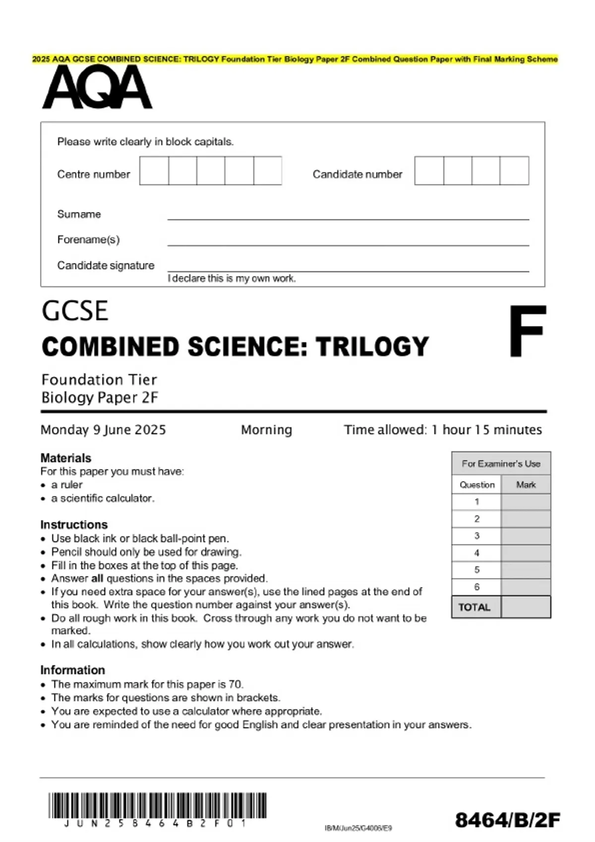 2025 AQA GCSE COMBINED SCIENCE: TRILOGY Foundation Tier Biology Paper 2F Combined Question Paper with Final Marking Scheme
