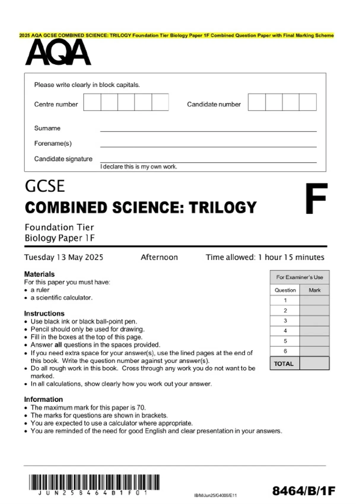 2025 AQA GCSE COMBINED SCIENCE: TRILOGY Foundation Tier Biology Paper 1F Combined Question Paper with Final Marking Scheme