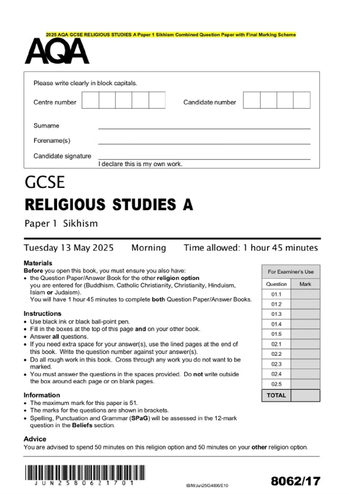 2025 AQA GCSE RELIGIOUS STUDIES A Paper 1 Sikhism Combined Question Paper with Final Marking Scheme