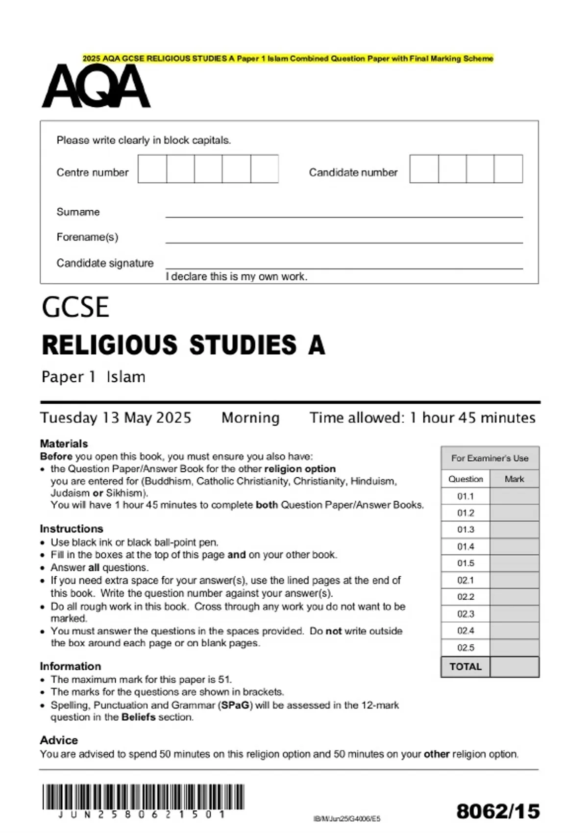 2025 AQA GCSE RELIGIOUS STUDIES A Paper 1 Islam Combined Question Paper with Final Marking Scheme