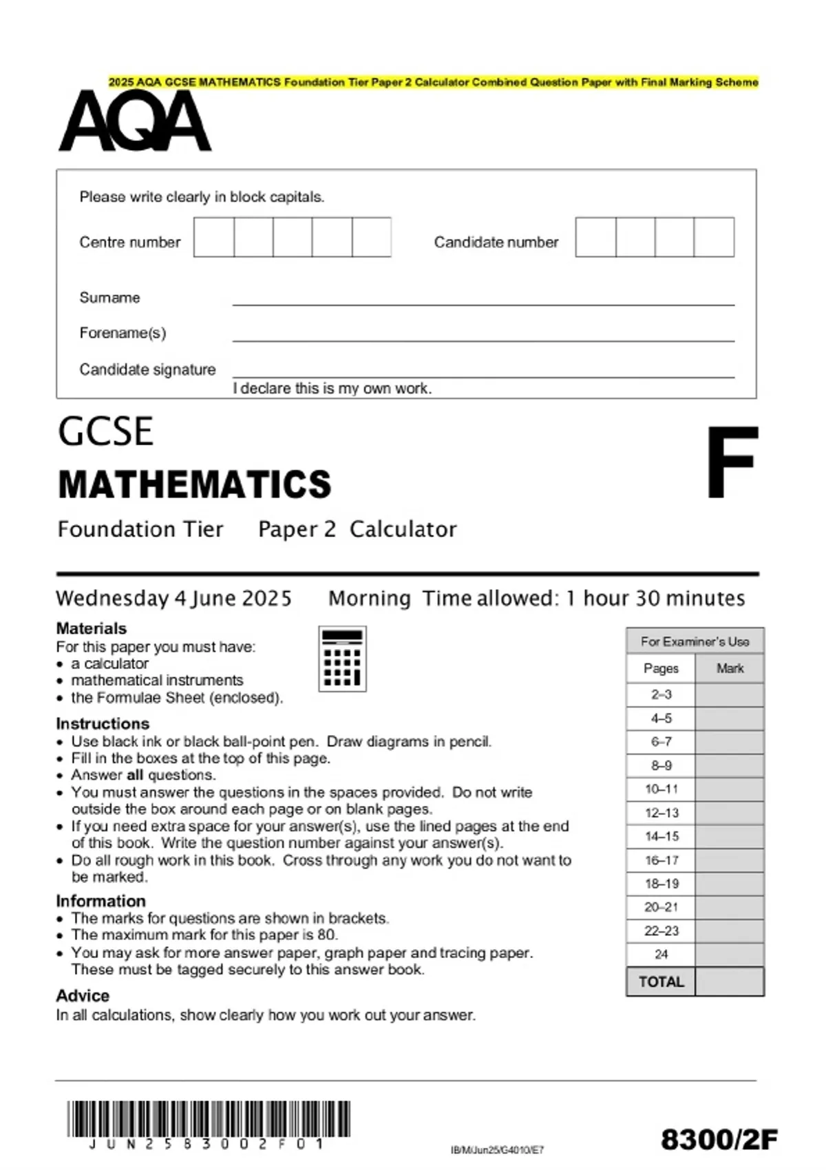 2025 AQA GCSE MATHEMATICS Foundation Tier Paper 2 Calculator Combined Question Paper with Final Marking Scheme