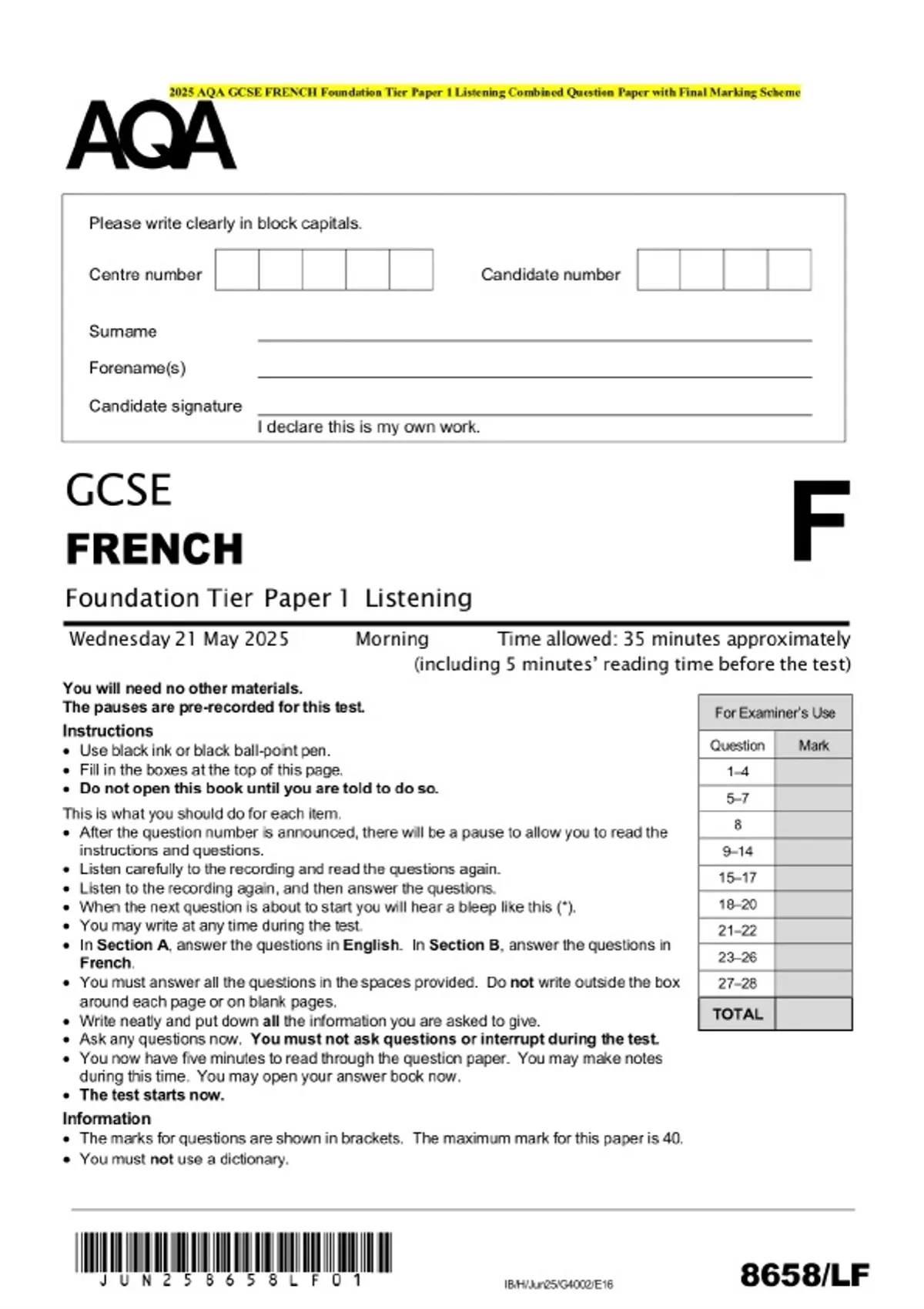 2025 AQA GCSE FRENCH Foundation Tier Paper 1 Listening Combined Question Paper with Final Marking Scheme