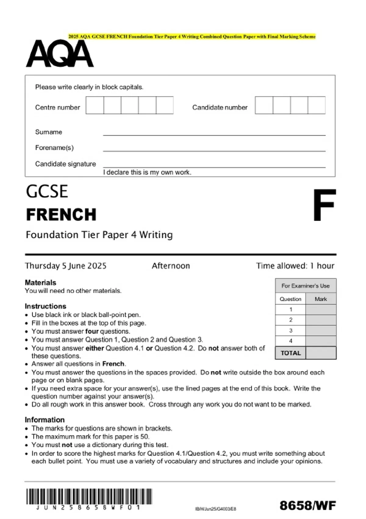2025 AQA GCSE FRENCH Foundation Tier Paper 4 Writing Combined Question Paper with Final Marking Scheme