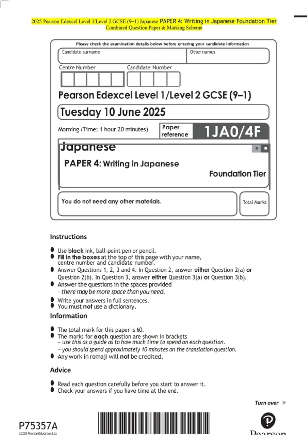 2025 Pearson Edexcel Level 1/Level 2 GCSE (9–1) Japanese PAPER 4: Writing in Japanese Foundation Tier Exam Paper and marking scheme