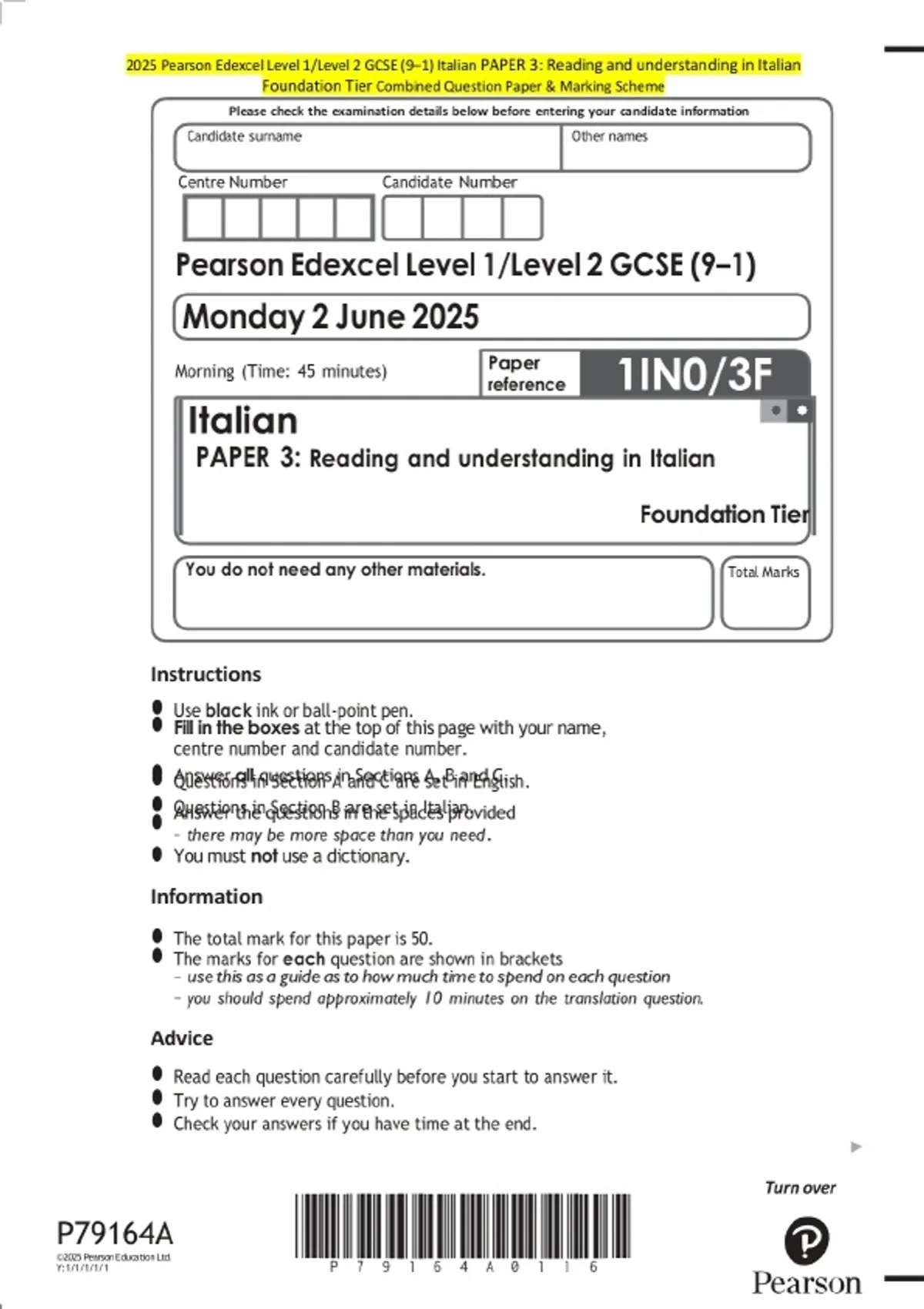 2025 Pearson Edexcel Level 1/Level 2 GCSE (9–1) Italian PAPER 3: Reading and understanding in Italian Foundation Tier Exam Paper and marking scheme