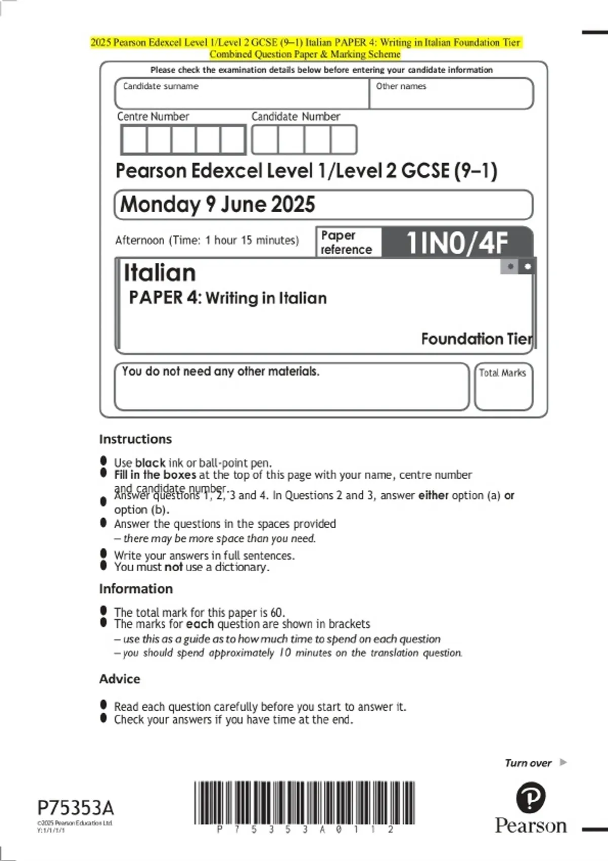 2025 Pearson Edexcel Level 1/Level 2 GCSE (9–1) Italian PAPER 4: Writing in Italian Foundation Tier Exam Paper and marking scheme