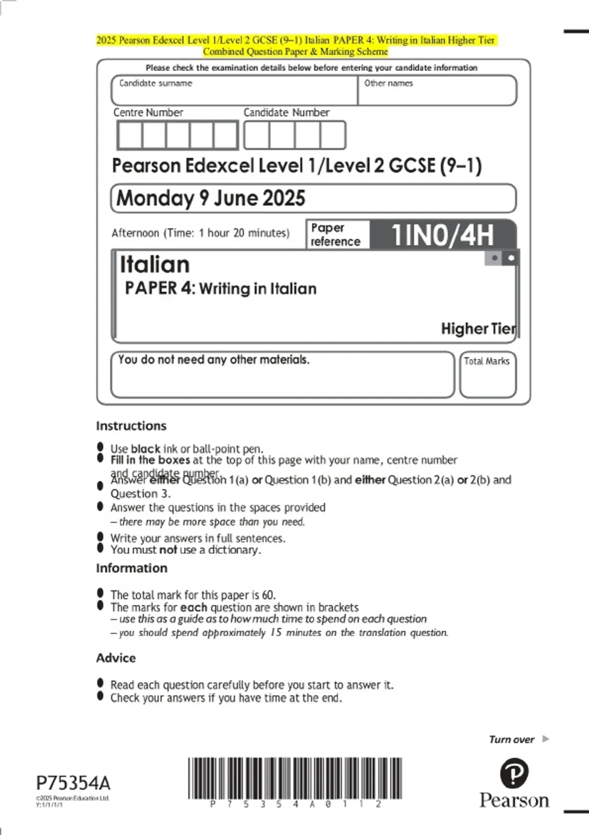 2025 Pearson Edexcel Level 1/Level 2 GCSE (9–1) Italian PAPER 4: Writing in Italian Higher Tier Exam Paper and marking scheme