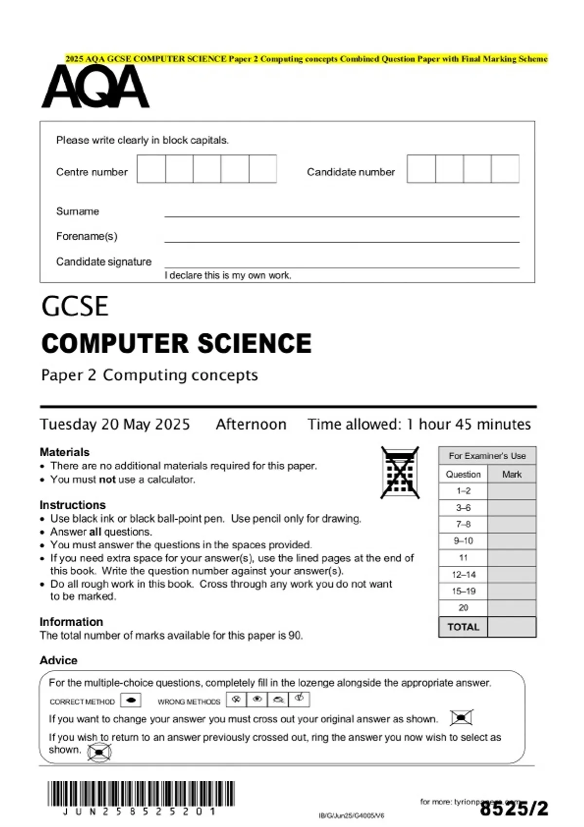 Package Deal-::2025 AQA GCSE COMPUTER SCIENCE Paper 1 & 2-Question Paper & Marking Scheme MERGED
