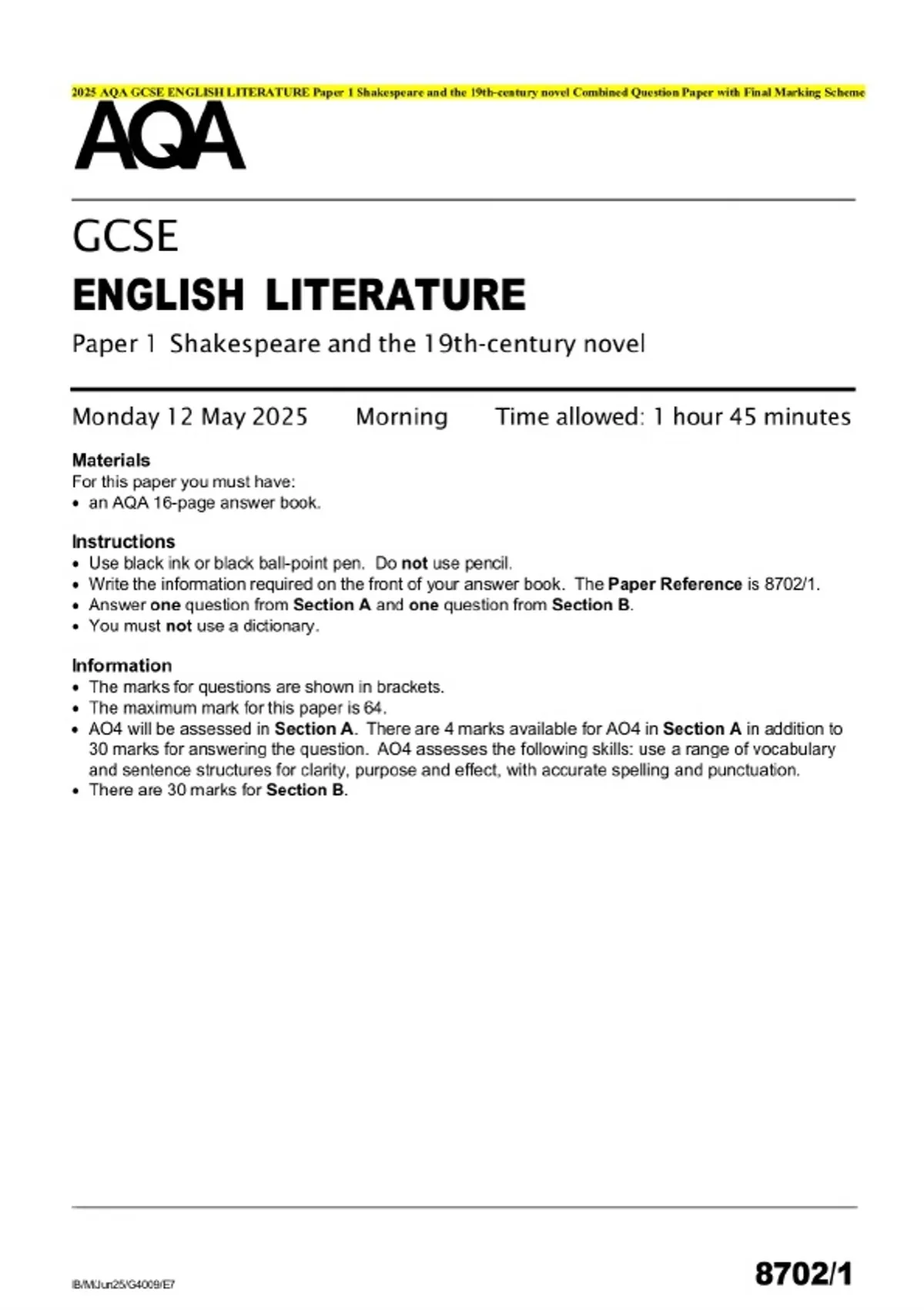 2025 AQA GCSE ENGLISH LITERATURE Paper 1 Shakespeare and the 19th-century novel Combined Question Paper with Final Marking Scheme