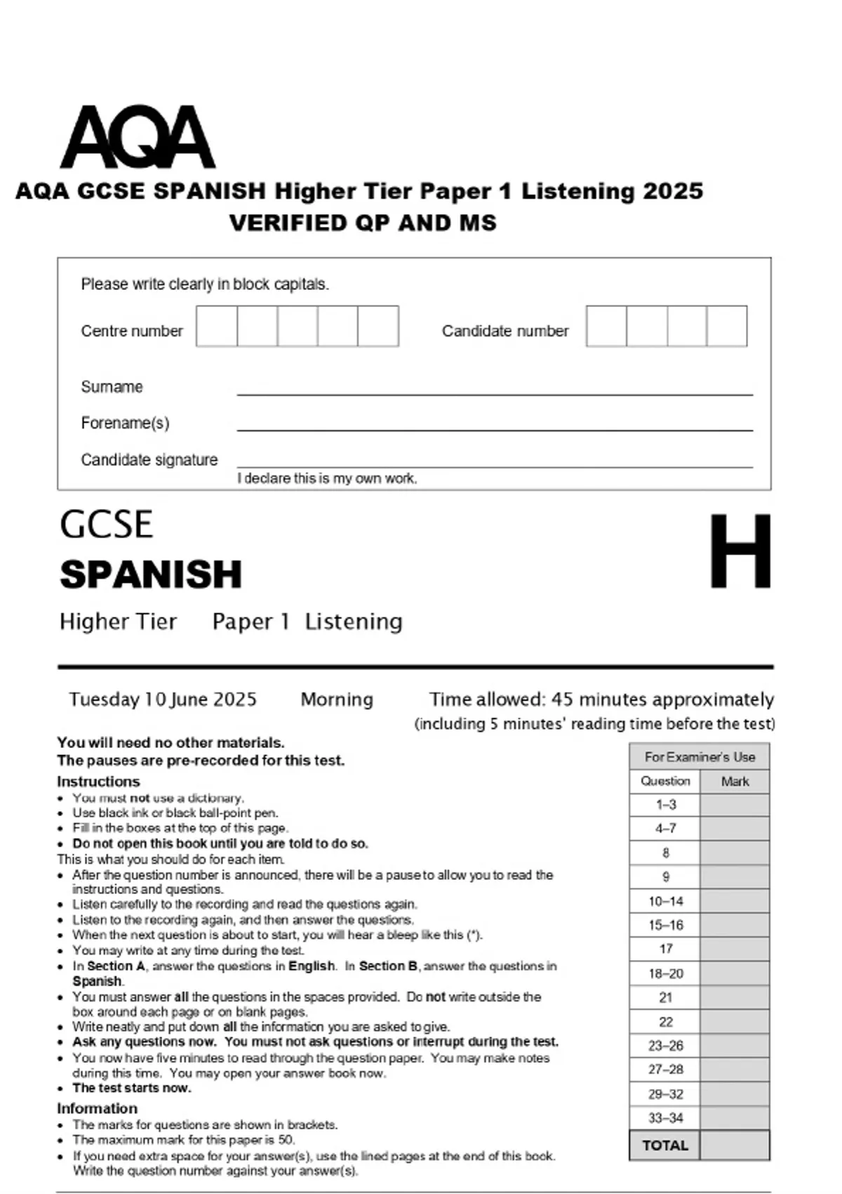 AQA GCSE SPANISH Higher Tier Paper 1 Listening 2025 VERIFIED QP AND MS