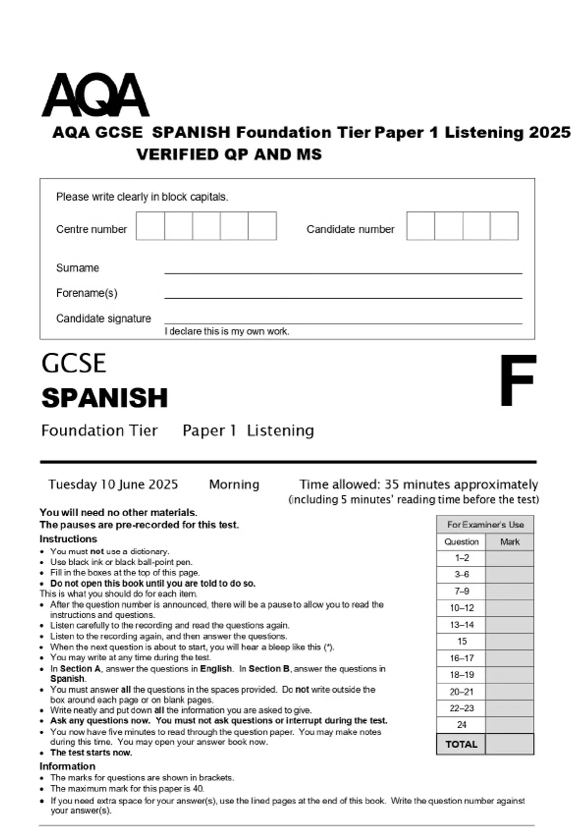 AQA GCSE SPANISH Foundation Tier Paper 1 Listening 2025 VERIFIED QP AND MS