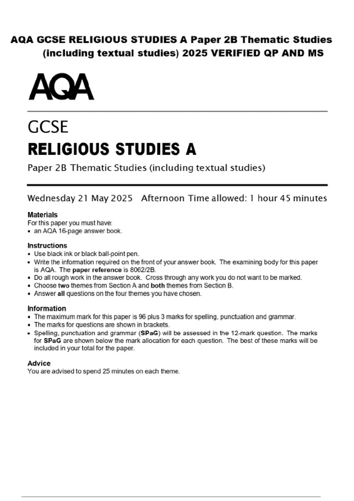 AQA GCSE RELIGIOUS STUDIES A Paper 2B Thematic Studies (including textual studies) 2025 VERIFIED QP AND MS
