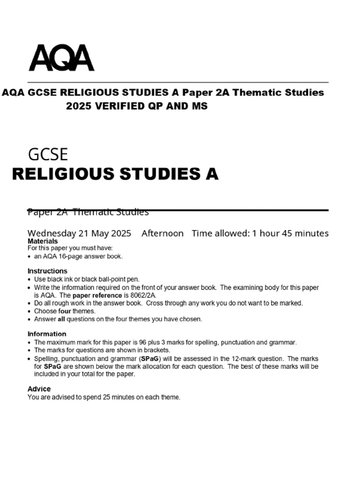 AQA GCSE RELIGIOUS STUDIES A Paper 2A Thematic Studies 2025 VERIFIED QP AND MS
