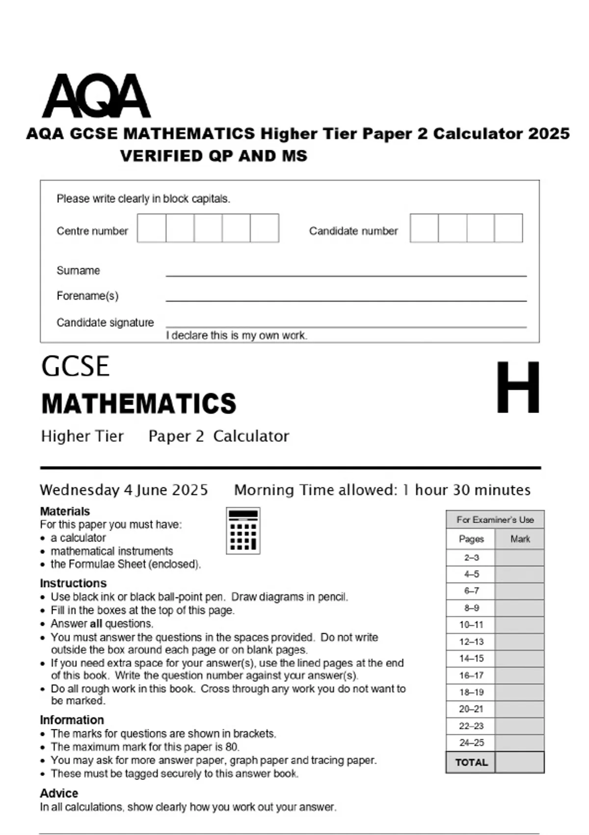 AQA GCSE MATHEMATICS Higher Tier Paper 2 Calculator 2025 VERIFIED QP AND MS