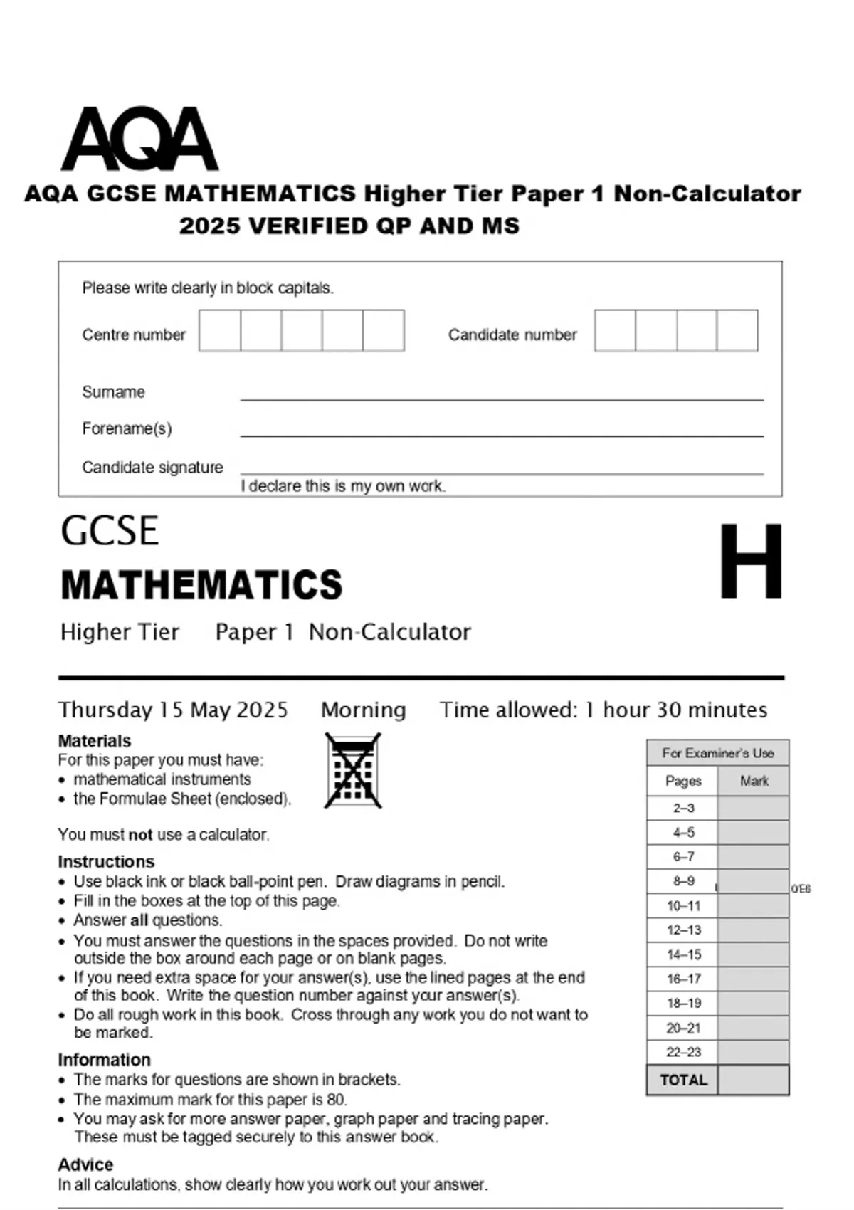 AQA GCSE MATHEMATICS Higher Tier Paper 1 Non-Calculator 2025 VERIFIED QP AND MS