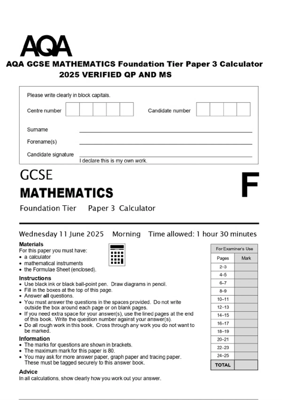 AQA GCSE MATHEMATICS Foundation Tier Paper 3 Calculator 2025 VERIFIED QP AND MS