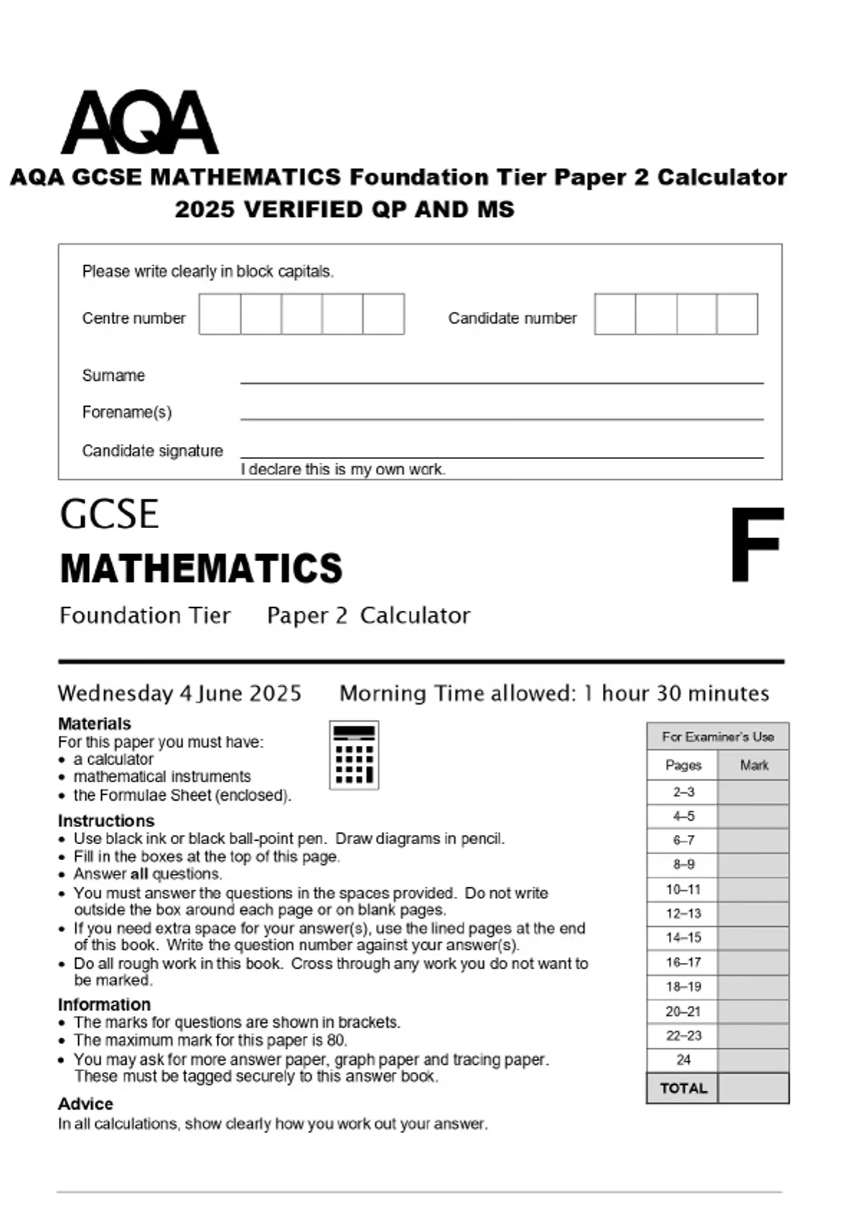 AQA GCSE MATHEMATICS Foundation Tier Paper 2 Calculator 2025 VERIFIED QP AND MS