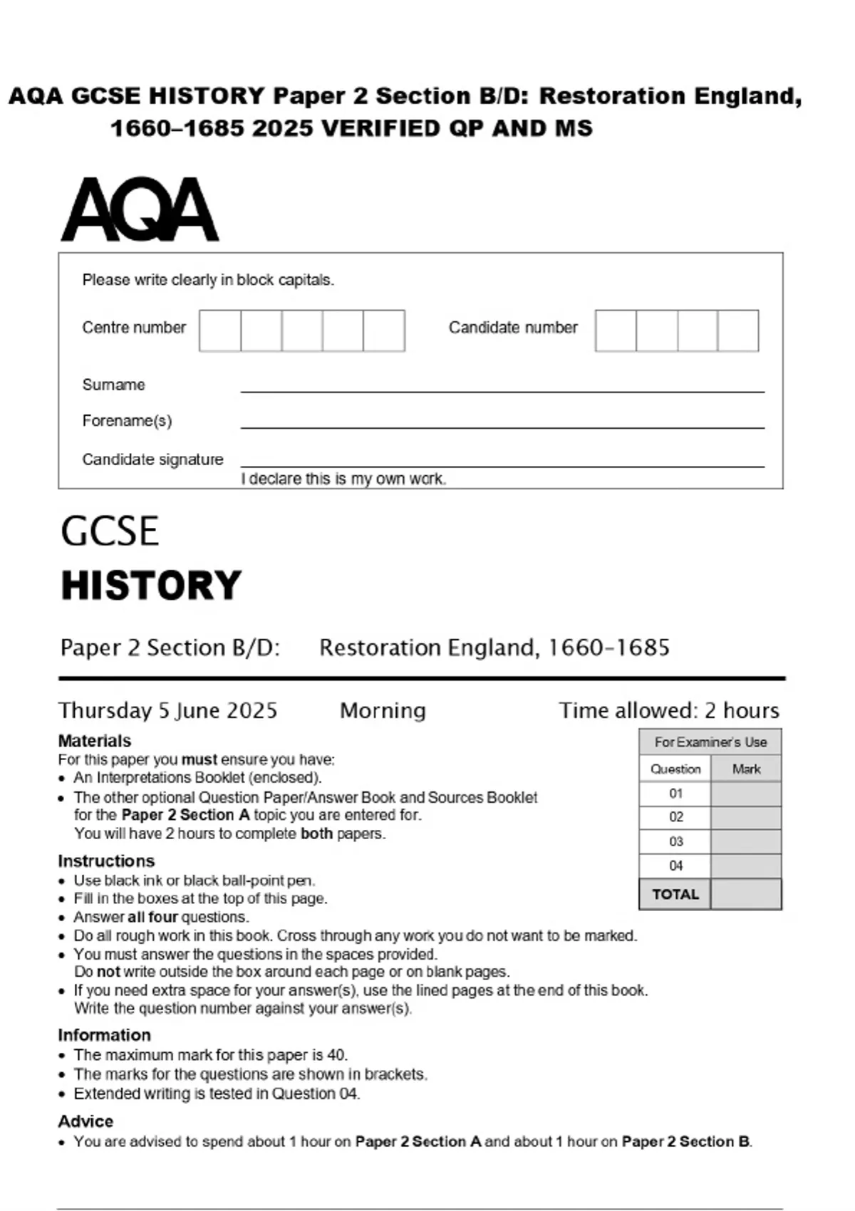 AQA GCSE HISTORY Paper 2 Section B/D: Restoration England, 1660– VERIFIED QP AND MS