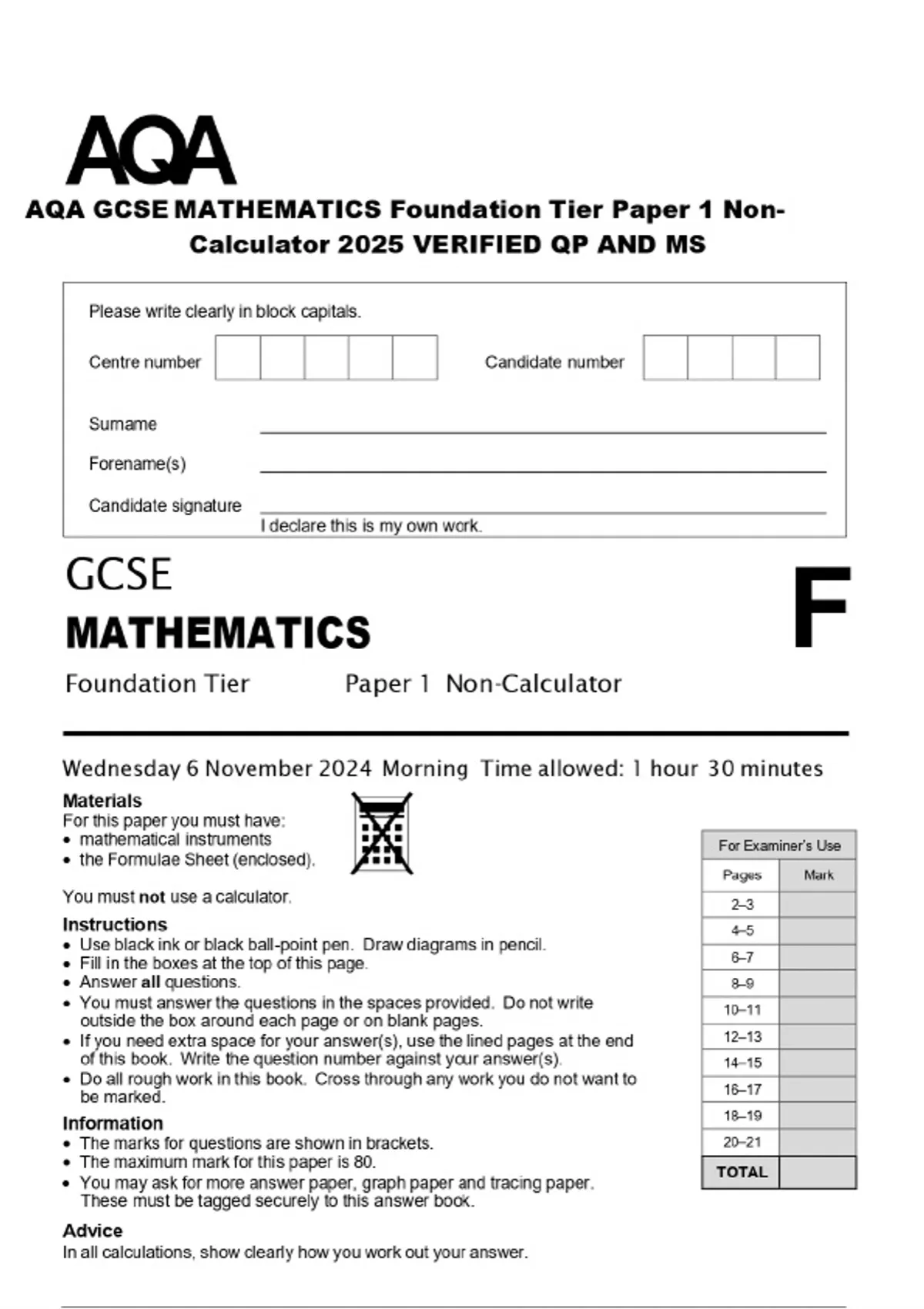 AQA GCSE MATHEMATICS Foundation Tier Paper 1 Non Calculator 2025 VERIFIED QP AND MS