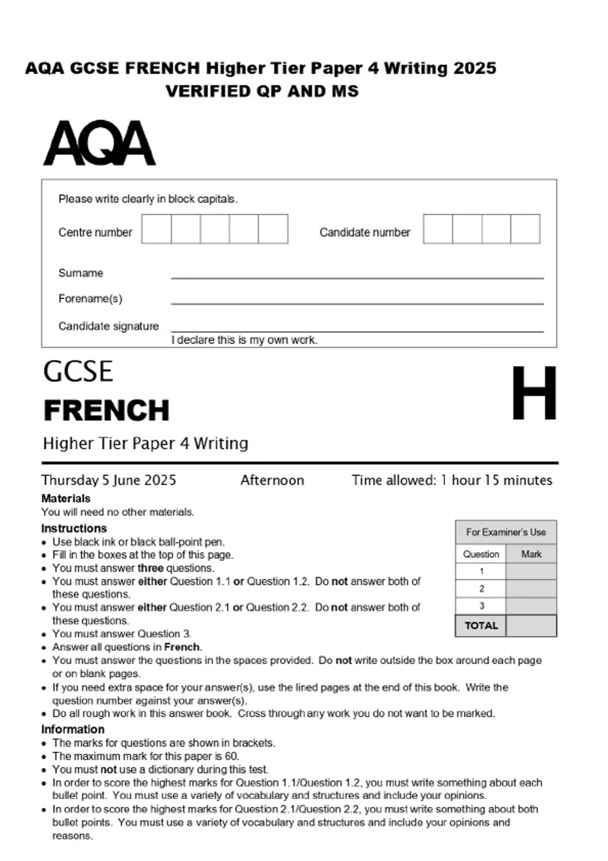 AQA GCSE FRENCH Higher Tier Paper 4 Writing 2025 VERIFIED QP AND MS