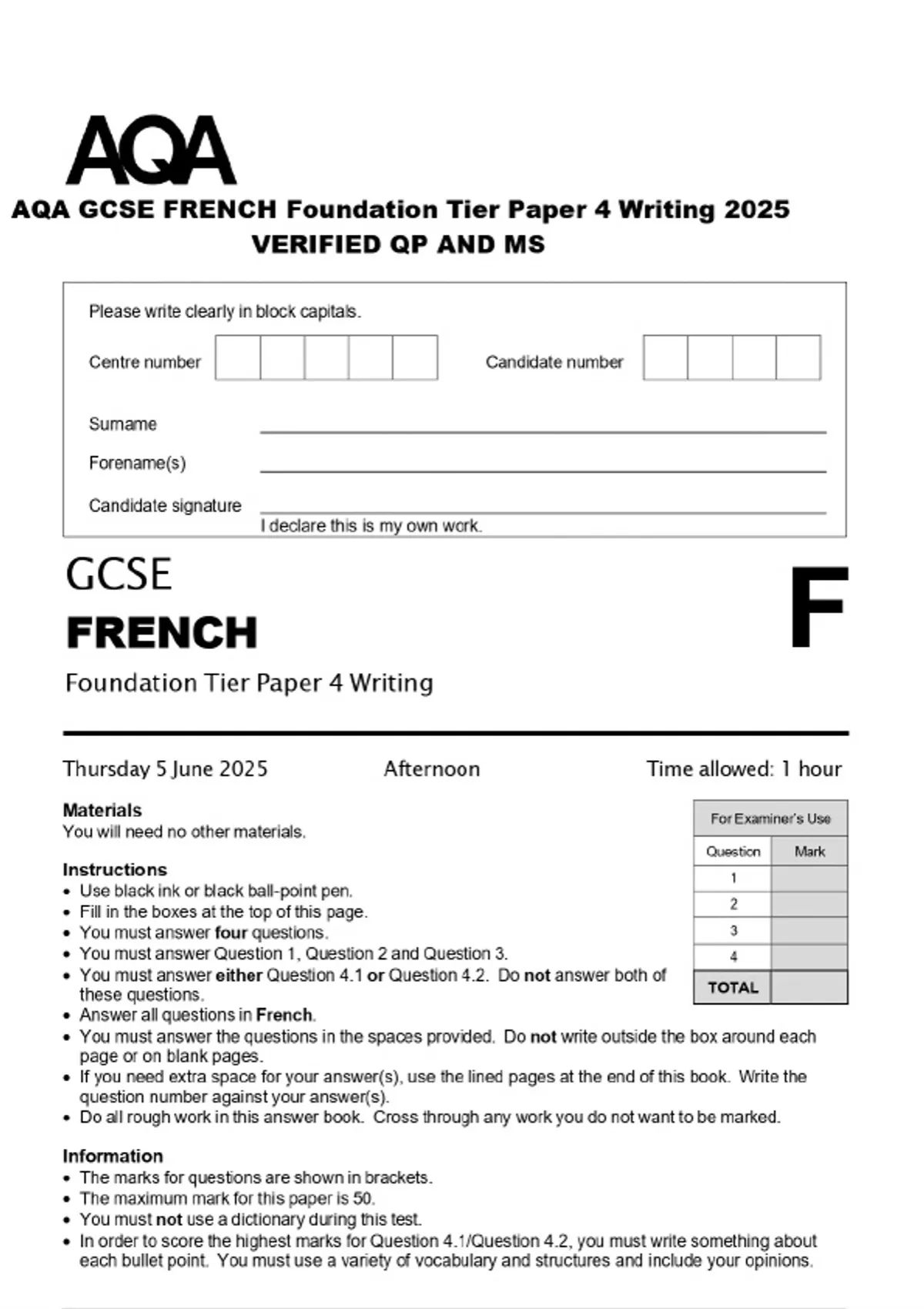 AQA GCSE FRENCH Foundation Tier Paper 4 Writing 2025 VERIFIED QP AND MS