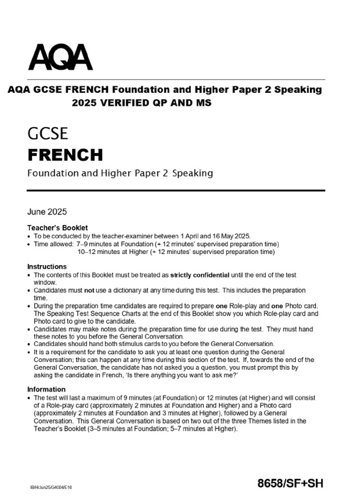 AQA GCSE FRENCH Foundation and Higher Paper 2 Speaking 2025 VERIFIED QP AND MS