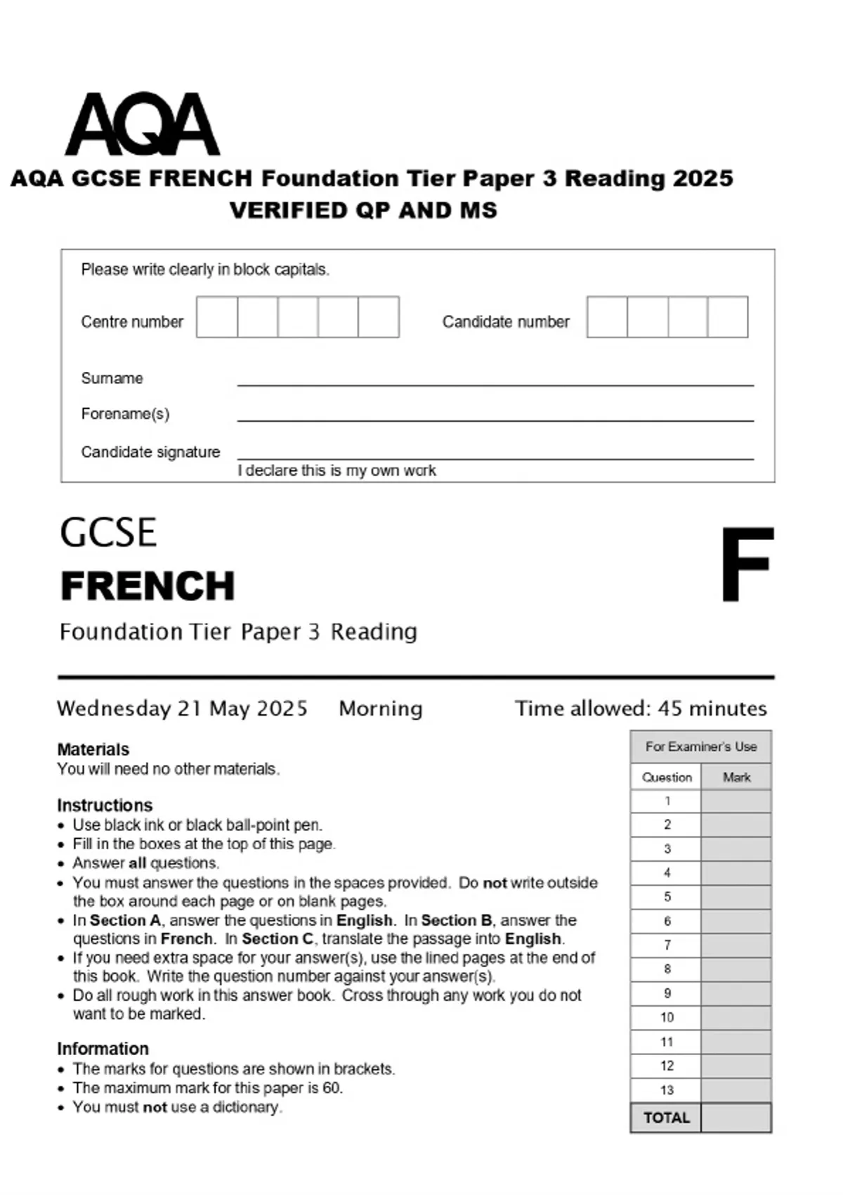 AQA GCSE FRENCH Foundation Tier Paper 3 Reading 2025 VERIFIED QP AND MS
