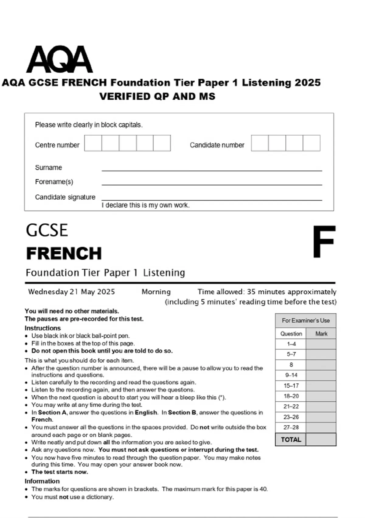 AQA GCSE FRENCH Foundation Tier Paper 1 Listening 2025 VERIFIED QP AND MS