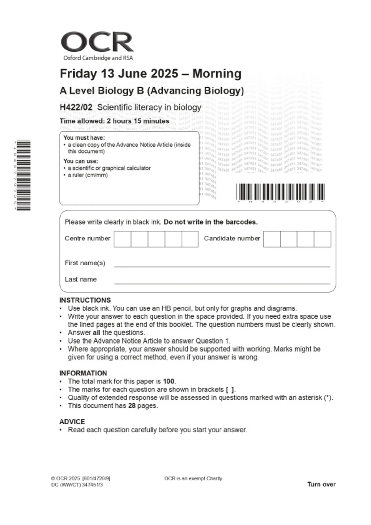 2025 OCR A Level Biology B (Advancing Biology) H422/02 Scientific literacy in biology Combined Question Paper & Final Marking Scheme
