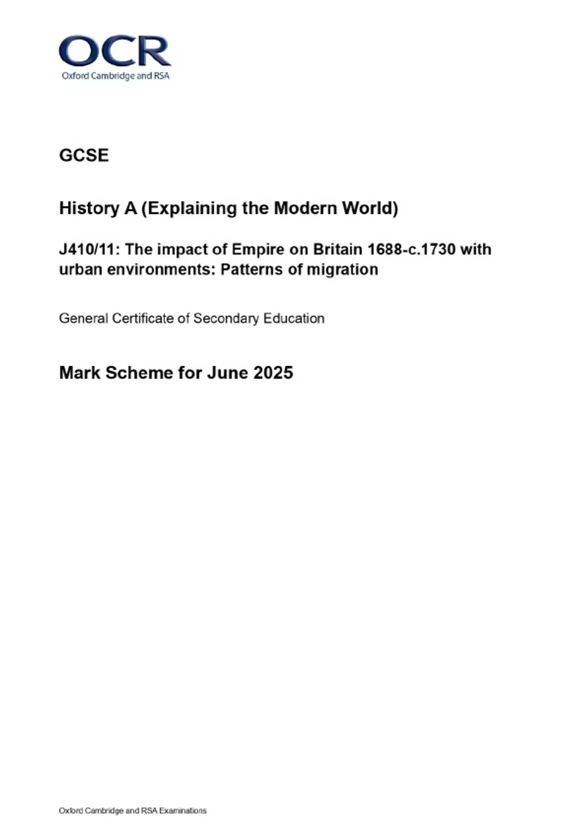 2025 OCR GCSE History A (Explaining the Modern World) J410/11: The impact of Empire on Britain 1688-c.1730 with urban environments: Patterns of migration - Final Marking Scheme