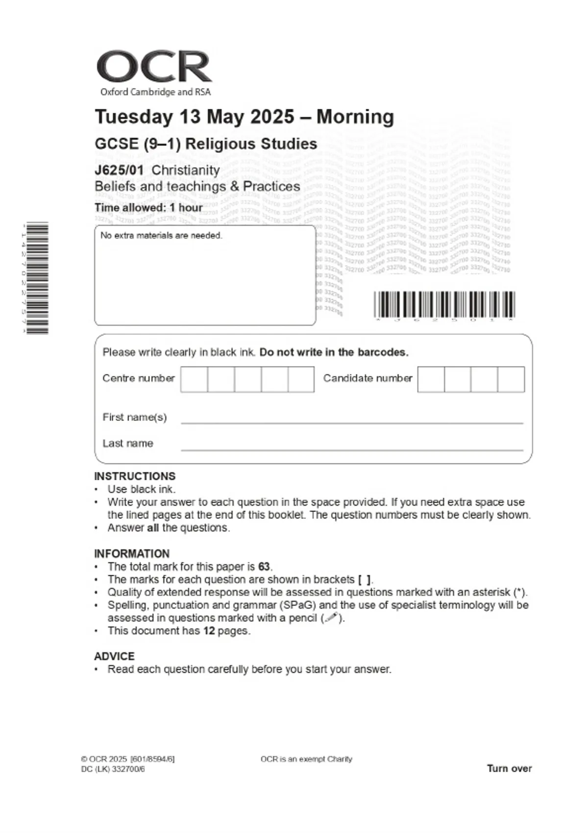 2025 OCR GCSE (9–1) Religious Studies J625/01 Christianity Beliefs and teachings & Practices Combined Question Paper & Final Marking Scheme