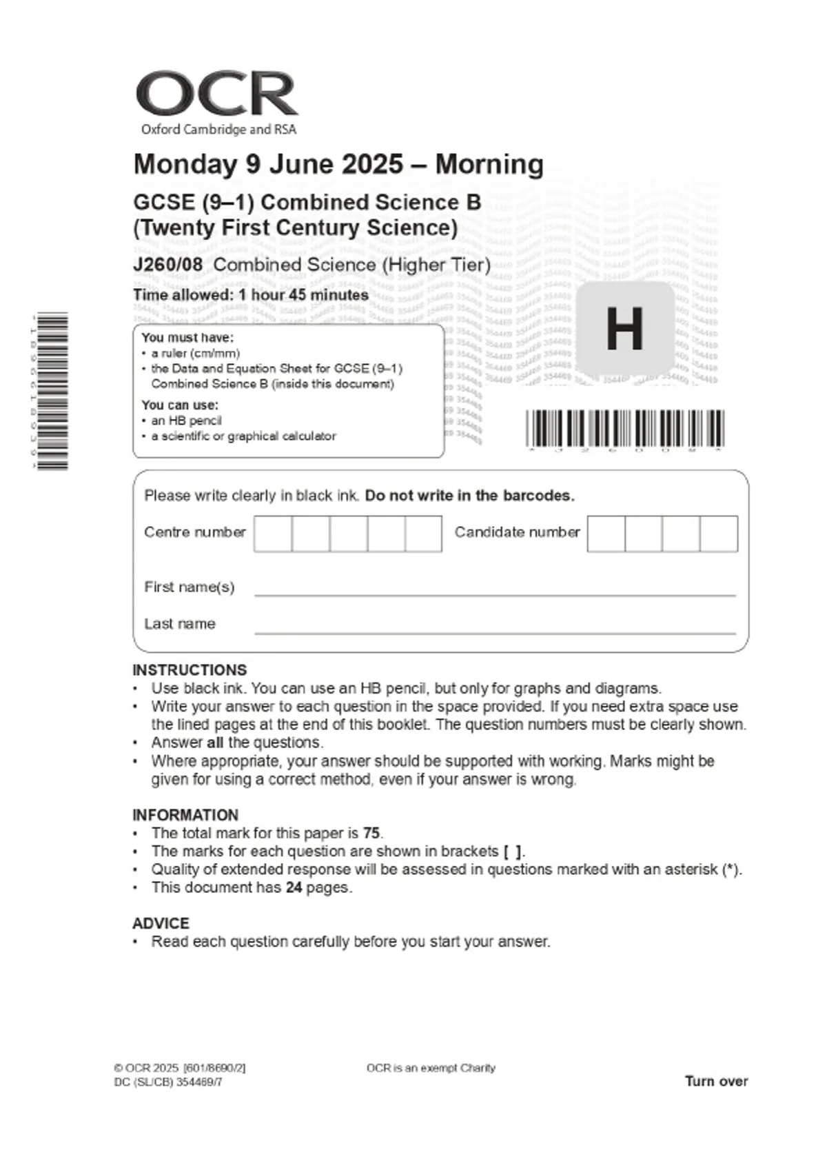 2025 OCR GCSE (9–1) in Combined Science B (Twenty First Century Science) J260/07 Physics (Higher Tier) Combined Question Paper & Final Marking Scheme