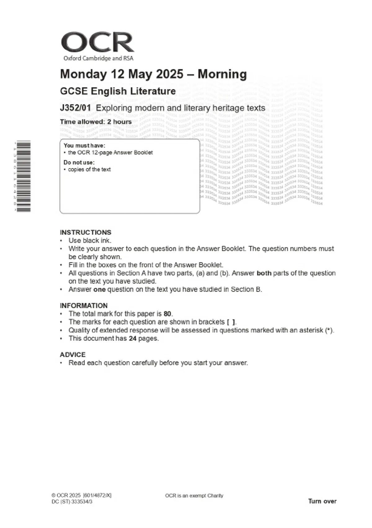 2025 OCR GCSE English Literature J352/01 Exploring modern and literary heritage texts Combined Question Paper & Final Marking Scheme