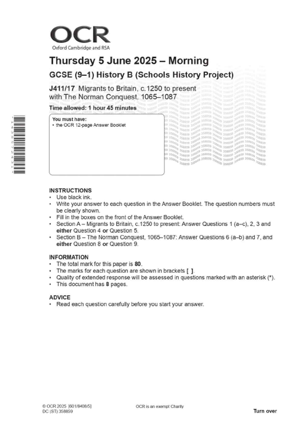 2025 OCR GCSE (9–1) History B (Schools History Project) J411/17 Migrants to Britain, c.1250 to present with The Norman Conquest, 1065–1087 Combined Question Paper & Final Marking Scheme