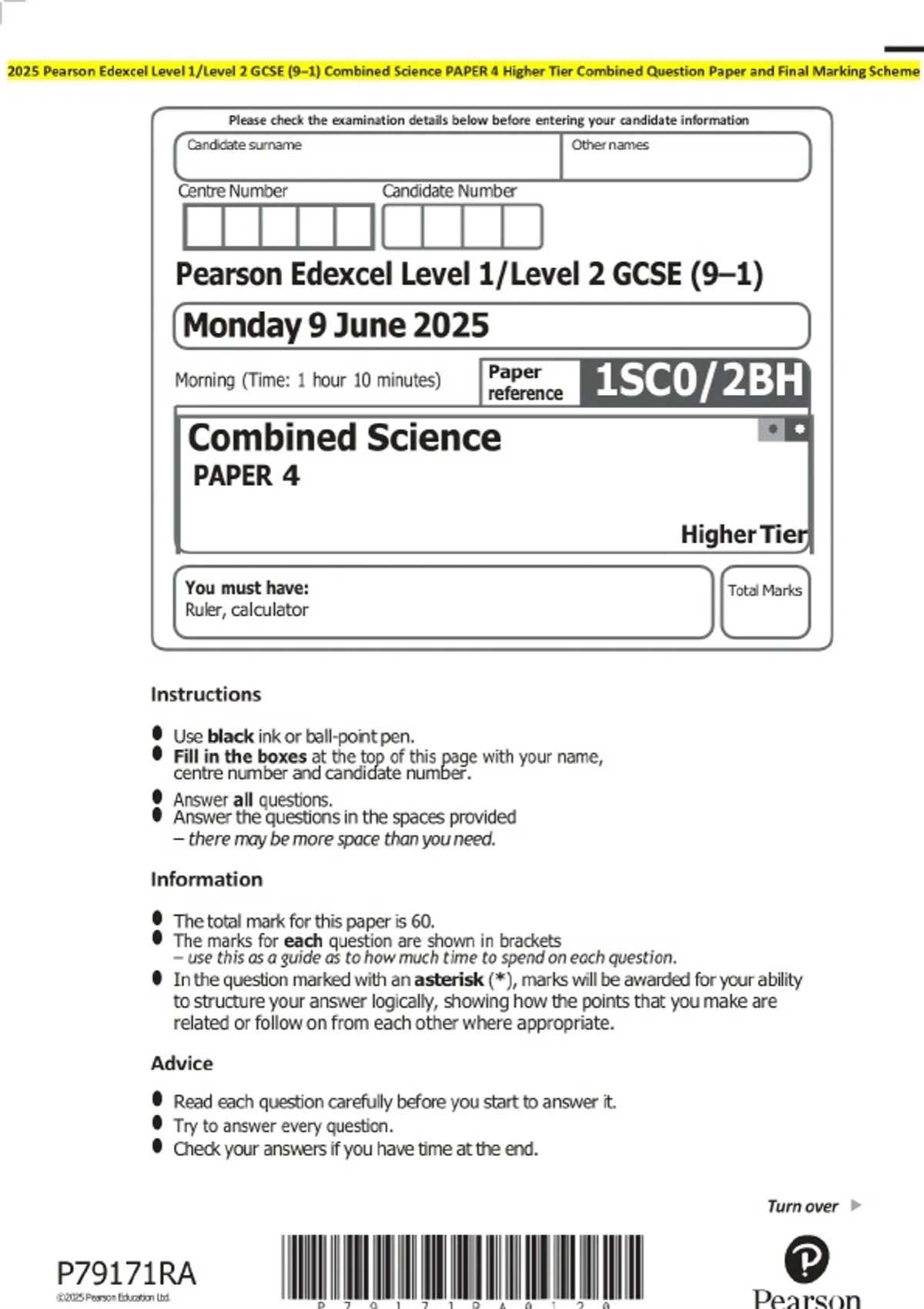2025 Pearson Edexcel Level 1/Level 2 GCSE (9–1) Combined Science PAPER 4 Higher Tier Exam paper & marking scheme
