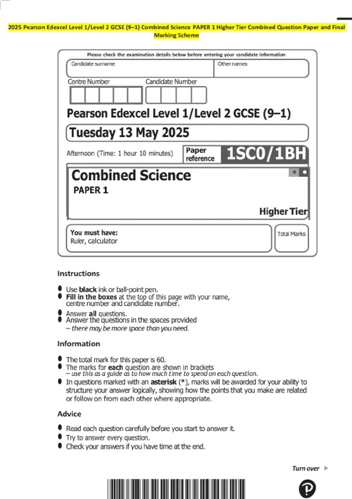 2025 Pearson Edexcel Level 1/Level 2 GCSE (9–1) Combined Science PAPER 1 Higher Tier Exam paper & marking scheme