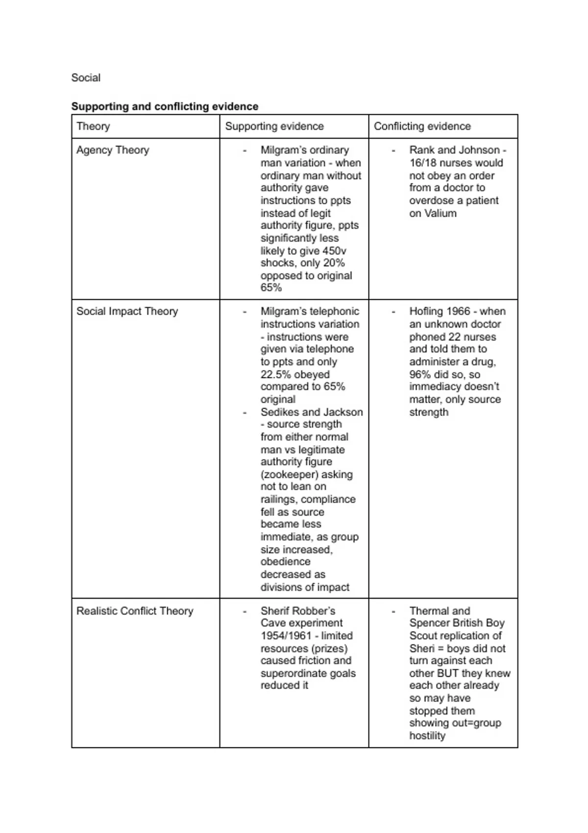 Theory Supporting evidence Conflicting evidence