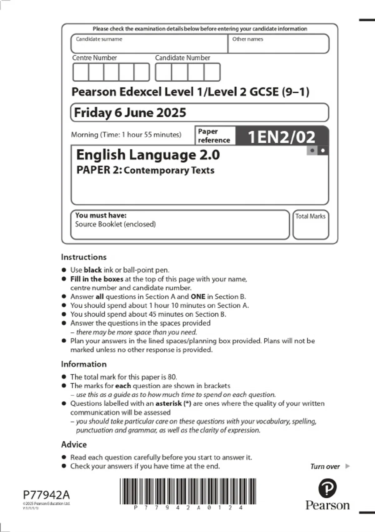 2025 Pearson Edexcel Level 1/Level 2 GCSE (9–1) English Language 2.0 PAPER 2: Contemporary Texts Combined Question Paper & Marking Scheme