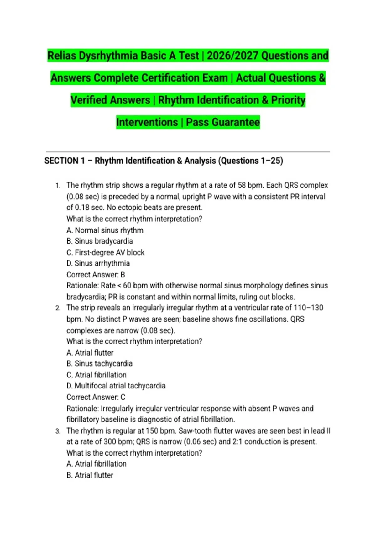 Relias Dysrhythmia Basic A Test | 2026/2027 Questions and Answers Complete Certification Exam | Actual Questions & Verified Answers | Rhythm Identification & Priority Interventions | Pass Guarantee