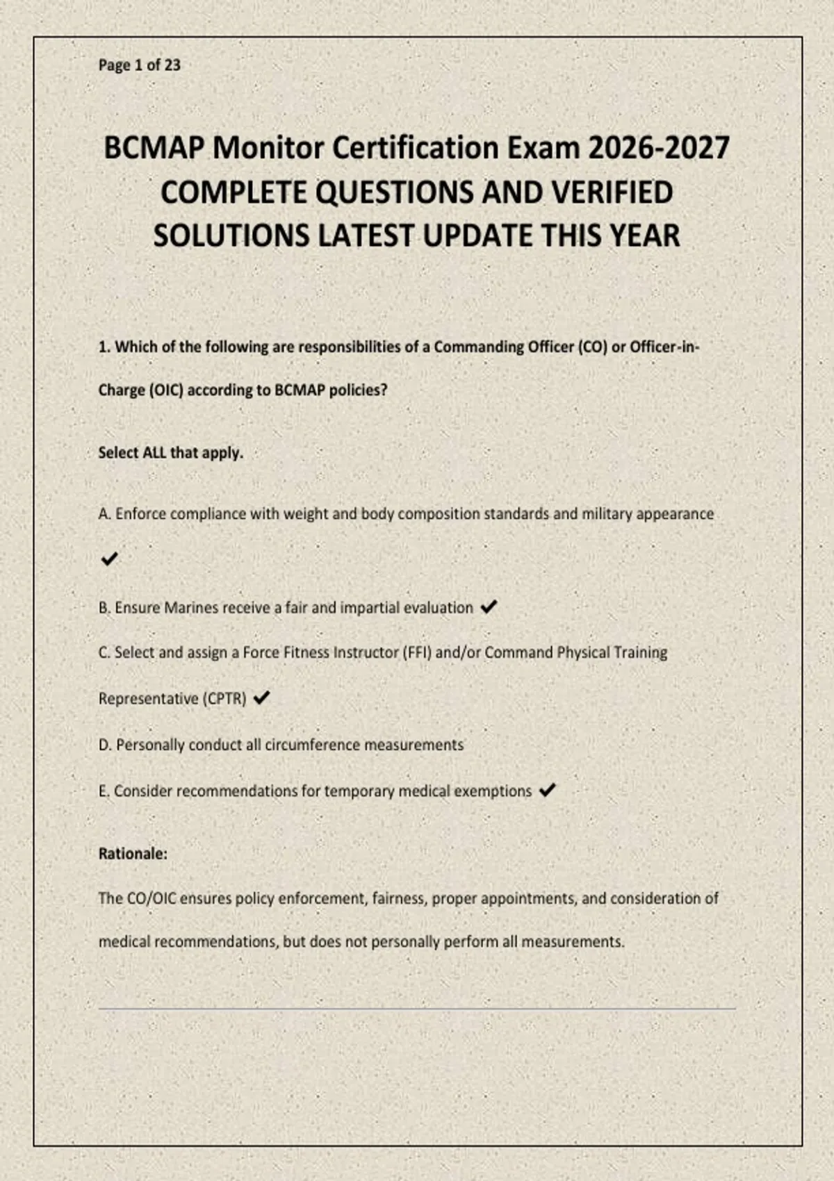 Tap on AVAILABLE IN BUNDLE / PACKAGE DEAL to unlock free bonus exams — save more while getting everything you need! You’ll be glad you did! The BCMAP Monitor Certification Exam 2026–2027 – Complete Questions and Verified Solutions (Latest Update This Year) delivers a fully updated and comprehensive collection of verified questions designed to help candidates confidently prepare for the BCMAP Monitor Certification examination. This in-depth study resource covers essential topics including monitoring protocols, patient assessment techniques, alarm recognition and response, safety procedures, documentation standards, regulatory compliance, and clinical best practices. Each question includes verified solutions to reinforce understanding, strengthen clinical reasoning, and enhance exam readiness. Ideal for healthcare professionals, clinical monitors, and individuals seeking BCMAP certification, this exam prep guide ensures thorough preparation and confident performance on the BCMAP Monitor Certification Exam 2026–2027.