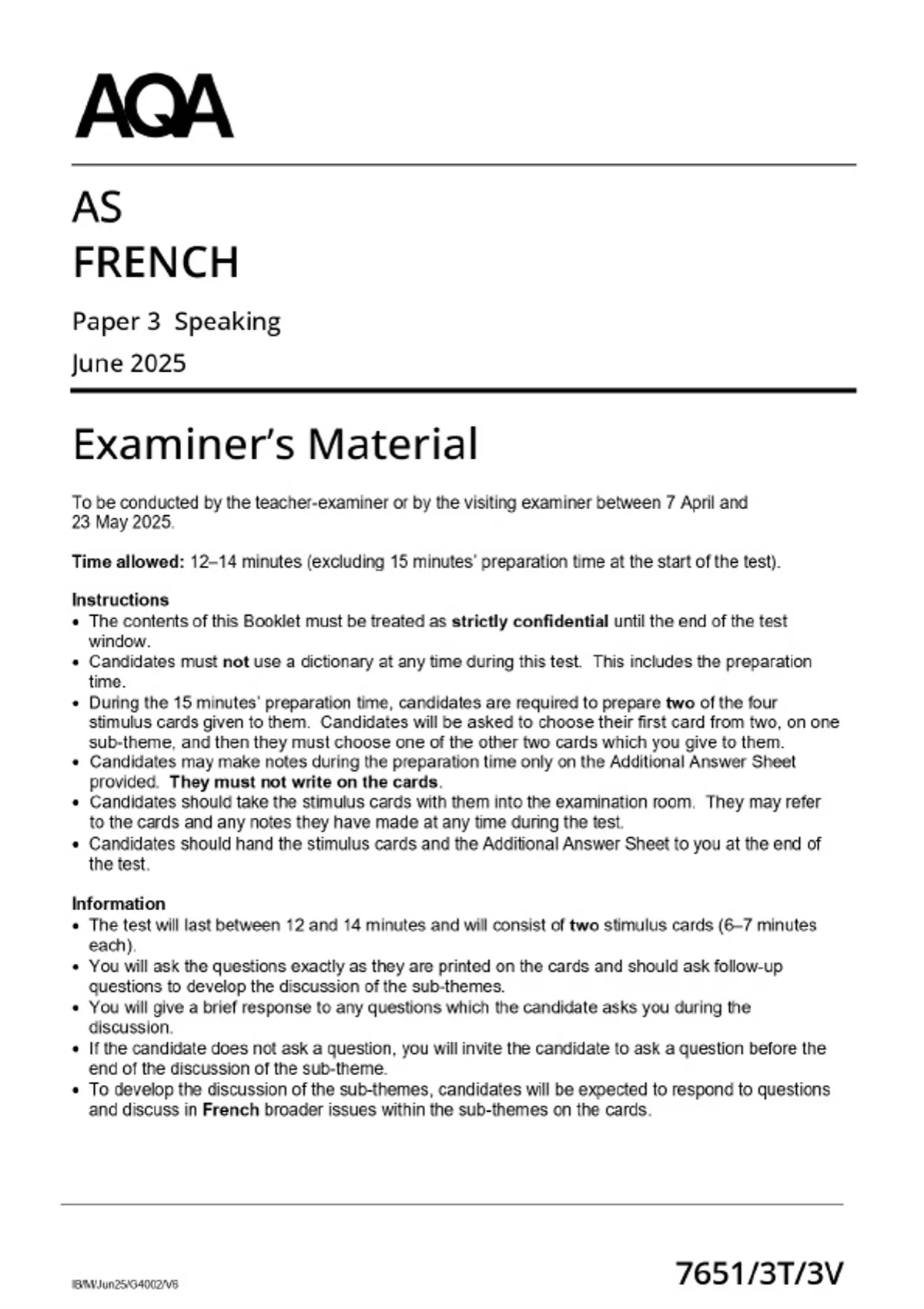 AQA AS French 7651/3T PAPER 3T Teacher conducted speaking test MERGED QUESTION PAPER & MARKSCHEME