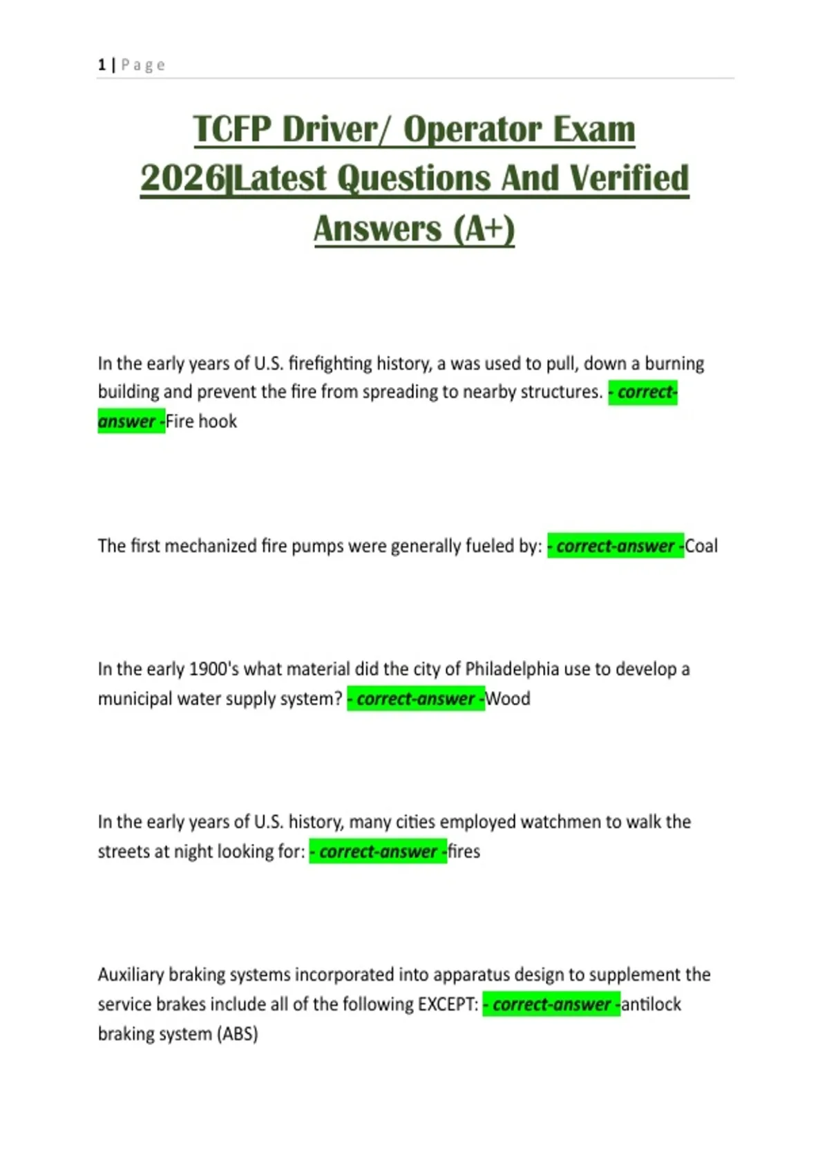 TCFP Driver/ Operator Exam 2026|Latest Questions And Verified Answers (A+)